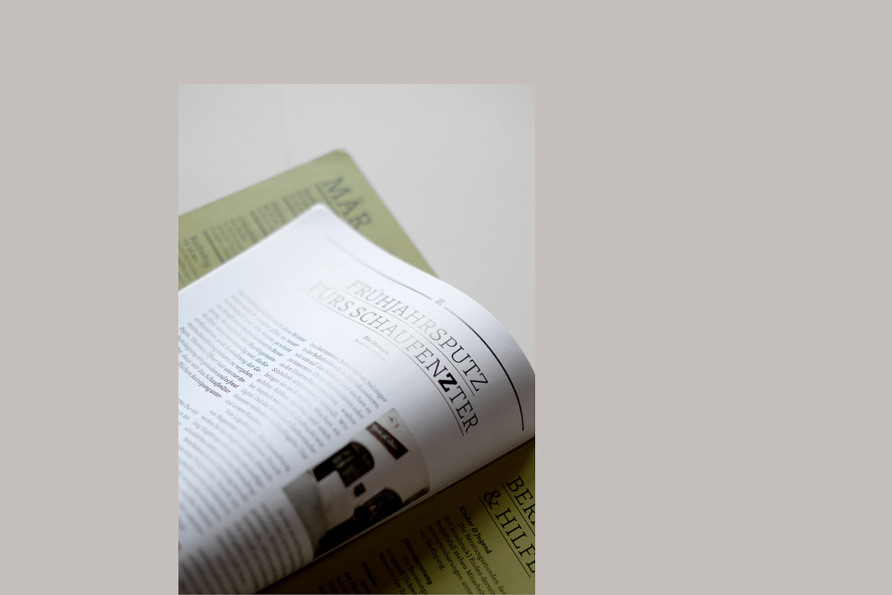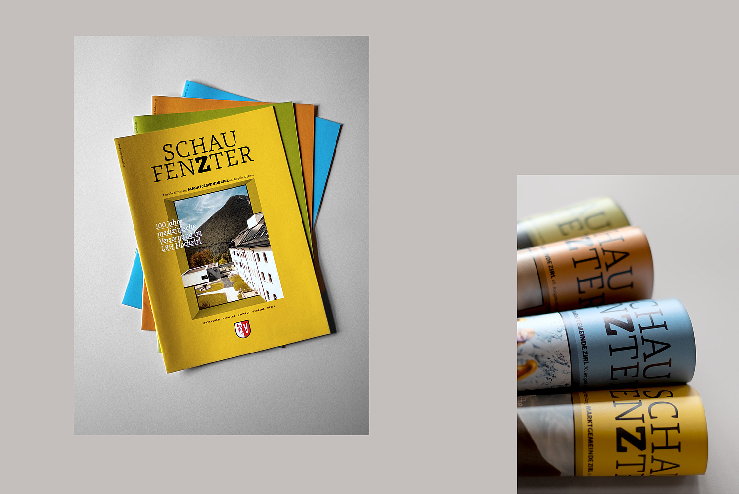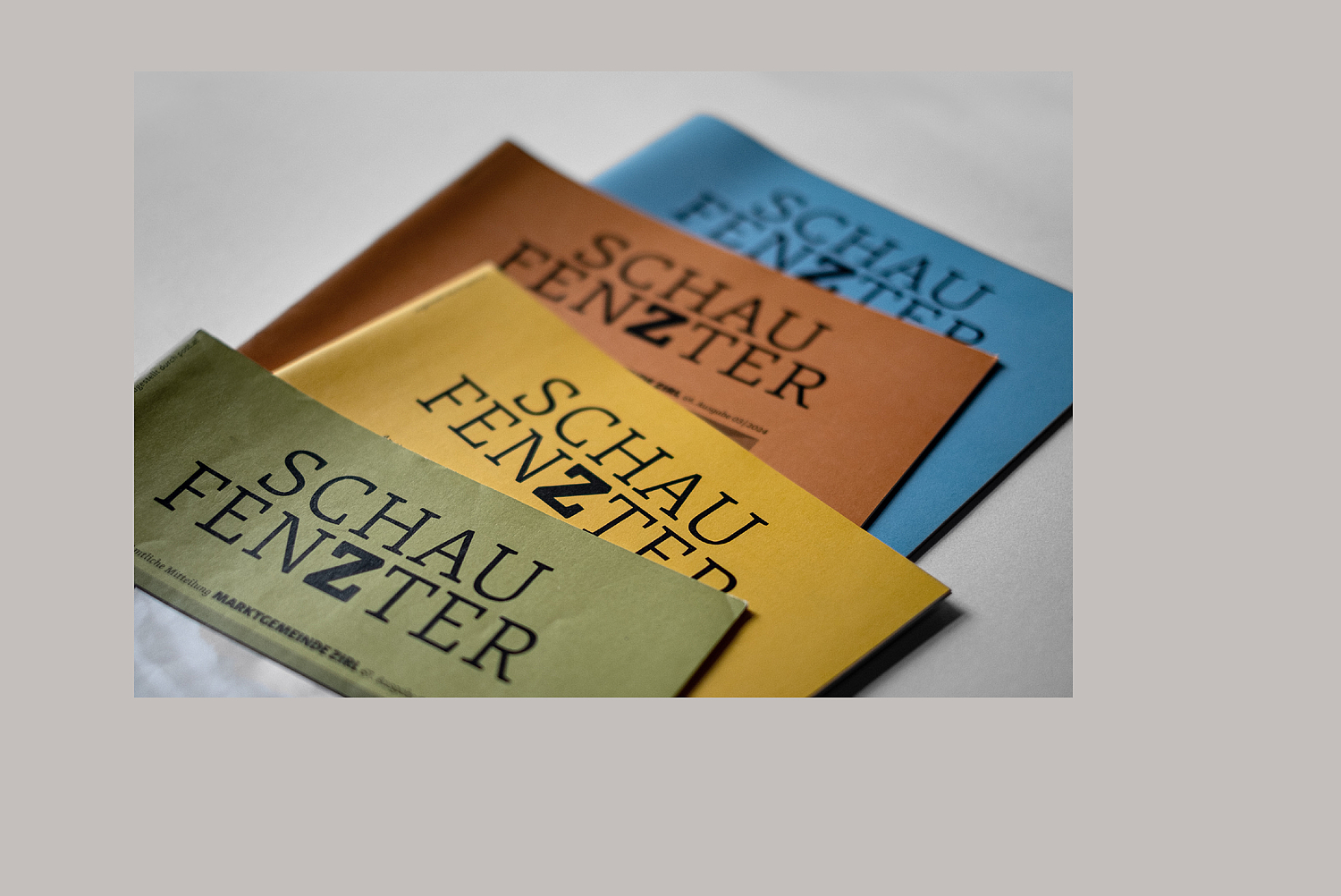 Im Zuge des Relaunchs der Gemeindezeitung Zirl wurde der Titel zum Leitmotiv: Wie durch ein „Schaufenster“ öffnen wir den Blick auf das bunte und vielfältige Leben in der Gemeinde. Jede der vier Ausgaben im Jahr erscheint in einer eigenen Farbe. Die neue Gestaltung überzeugt durch klare Struktur, ein modernes, lesefreundliches Schriftbild und mehr Raum für Inhalte. Gedruckt wird auf umweltfreundlichem Papier, das sich gut anfühlt und nachhaltig produziert werden kann.